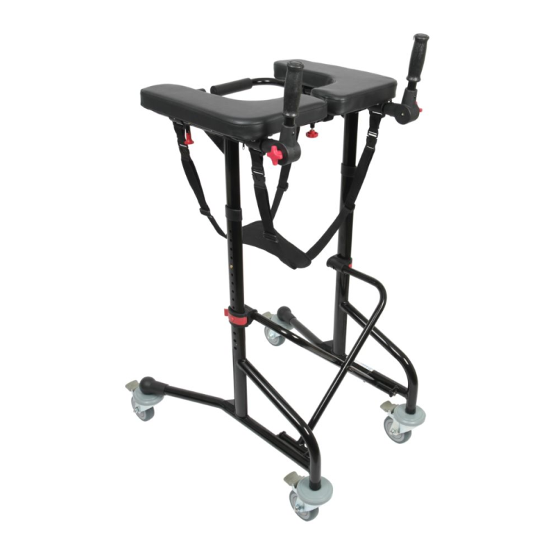 Rammen er fremstillet i let og robust pulverlakeret aluminium og er designet med fokus på individuel tilpasning. Armstøtterne kan justeres i både højde og bredde, støttehåndtagene kan vinkelindstilles, og gangstativets bredde kan tilpasses forskellige brugere og træningssituationer. Alle indstillinger kan foretages hurtigt og nemt uden brug af værktøj.