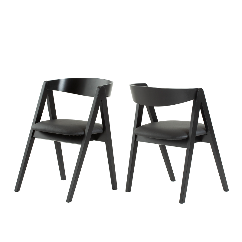 Dog kun så længe lager haves. Sæde er lækker sort semi anilin læder, og stel fås i fire farver. Stel er i massiv træ med formspændt finer i de buede ryglæn.