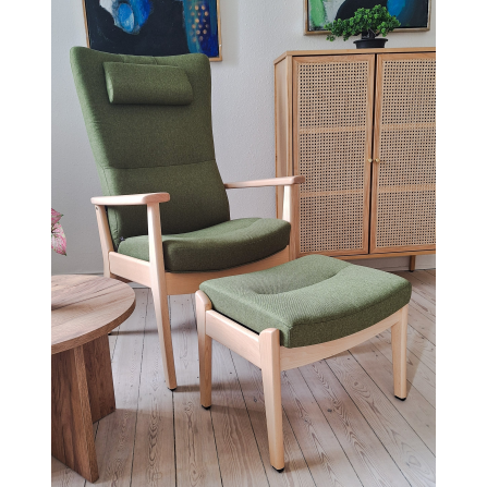 Tilpasningen af stoleben foretages på de færdige Quickship modeller, uden betydning for leveringstiden. Med stolen følger også en dejlig nakkepude, der kan justeres i højden. Ønsker du en lækker fodskammel med praktisk indbygget magasin - kan dette tilkøbes.